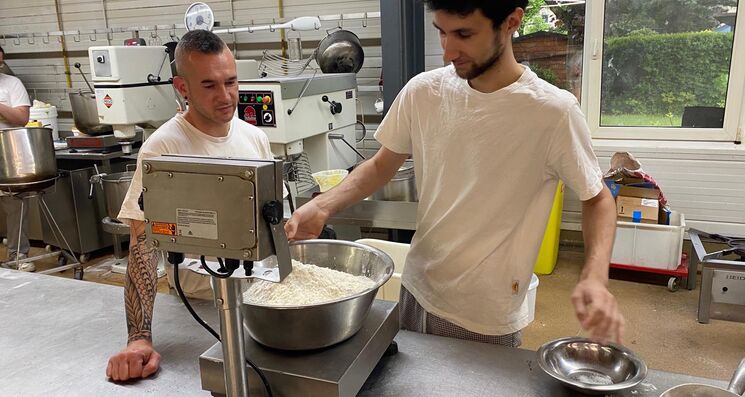 Es duftet schon auf dem Parkplatz nach ofenfrischem Kuchen und Brot. In der Backstube der Bäckerei Voigt in Chemnitz Erfenschlag kümmert sich Bäckermeister Michael Schäfer darum, dass die frischen Backwaren alle pünktlich in die Voigt-Filialen der ganzen Stadt geliefert werden können. Am Anfang war die große Bäckerei, der inzwischen zur Plauener Backwaren GmbH gehörenden Voigt Bäckerei, für ihn eine Umstellung: „Ich habe 2004 in meinem Heimatort in einer kleinen Bäckerei gelernt. Als ich dann zum jetzigen Arbeitgeber gewechselt bin, musste ich lernen in großen Mengen zu backen.“ Für den 38-Jährigen ist das heute keine Herausforderung mehr. Vielmehr war es wirklich schwierig, gibt er rückblickend zu, den Meistertitel in Teilzeit neben Job und Familie zu machen: „Es ging irgendwie. Aber die Zeit, die dabei drauf gegangen ist, war herausfordernd!“ Doch er wollte mit dem Meistertitel auch persönlich im Unternehmen weiterkommen. Das sah sein damaliger Chef genauso und hat ihm den Meisterlehrgang bezahlt. Abgeschlossen hat Schäfer ihn dann als bester seines Jahrgangs. Für die Zeit und die Unterstützung ist Schäfer heute sehr dankbar und ist mit seiner Arbeit zufriedener denn je. Eine Selbständigkeit kommt für ihn eher nicht in Frage, er fühlt sich im Unternehmen wohl. Denn noch einen positiven Effekt hat ihm der Meister beschert – er darf sich jetzt um die Auszubildenden kümmern. Das macht ihm viel Spaß, meint er und zeigt Azubi Fritz Böttcher wie viel Mehl fürs nächste Backrezept benötigt wird.